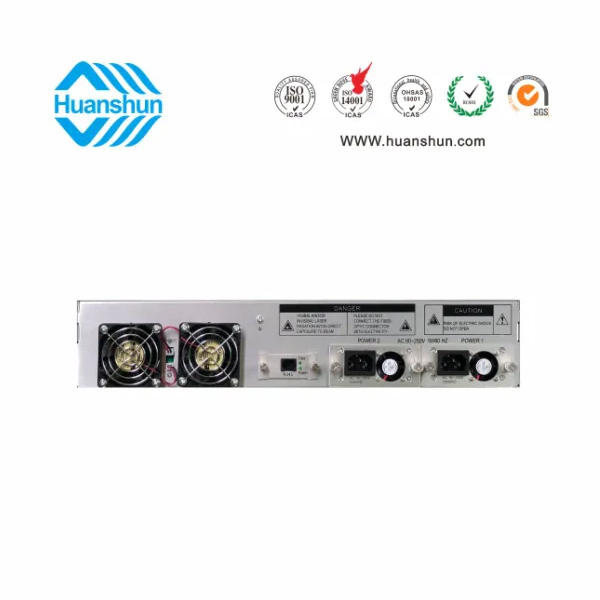 19 " 2U/3U標準機箱,-5 ~ +10 d Bm輸入,16路標稱規格(16、17、18、19、20、21、22、23、24dBm)放大輸出,并支持下調-2dB,安全連接模式,NF ≤ 5dB(0dBm時);內置FWDM合波器,插播損耗 ≤ 1dB;雙模塊熱插撥電源,AC90 ~ 255V或DC-48V供電,RJ45標準網管(支持SNMP、WEB)